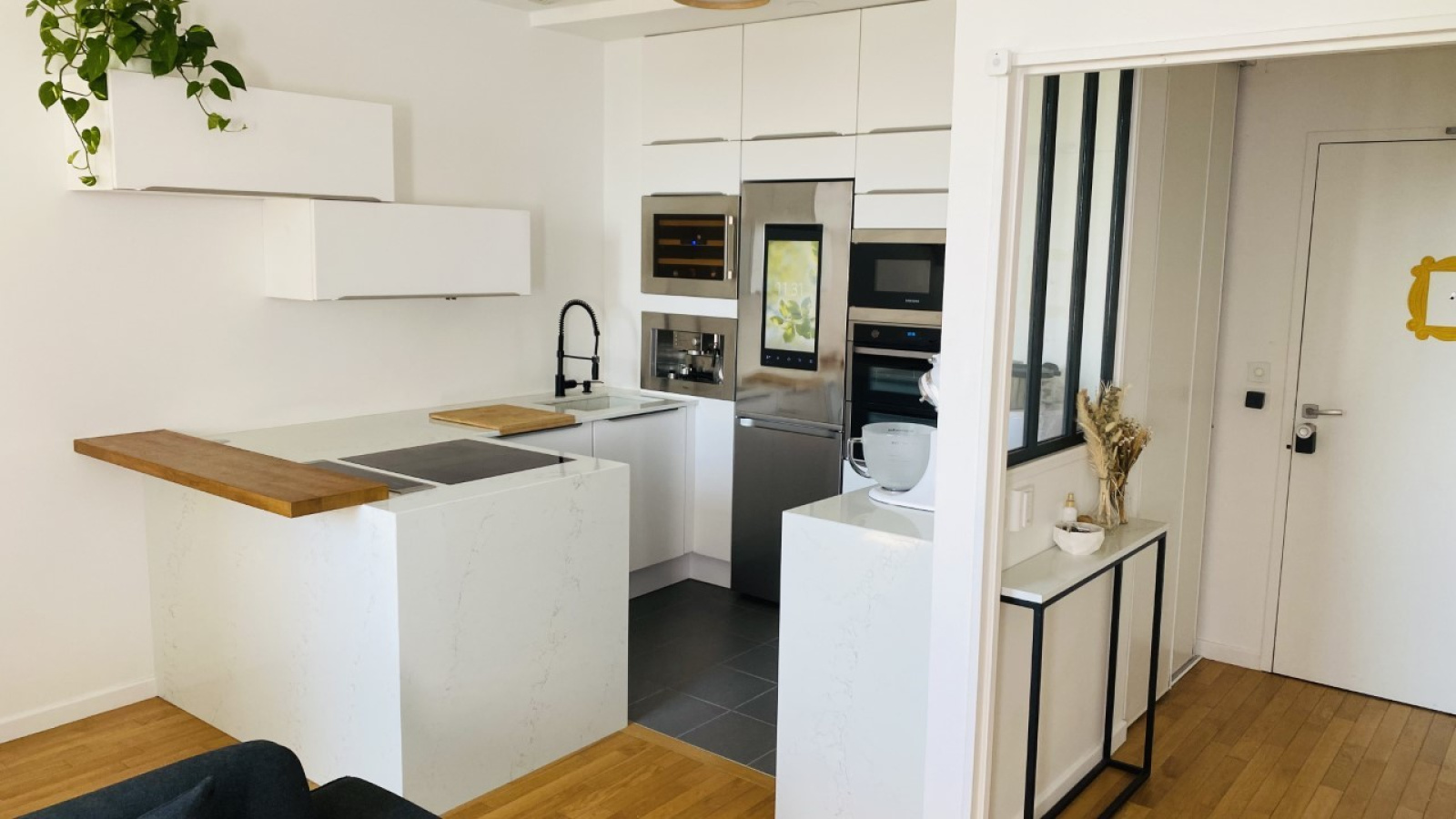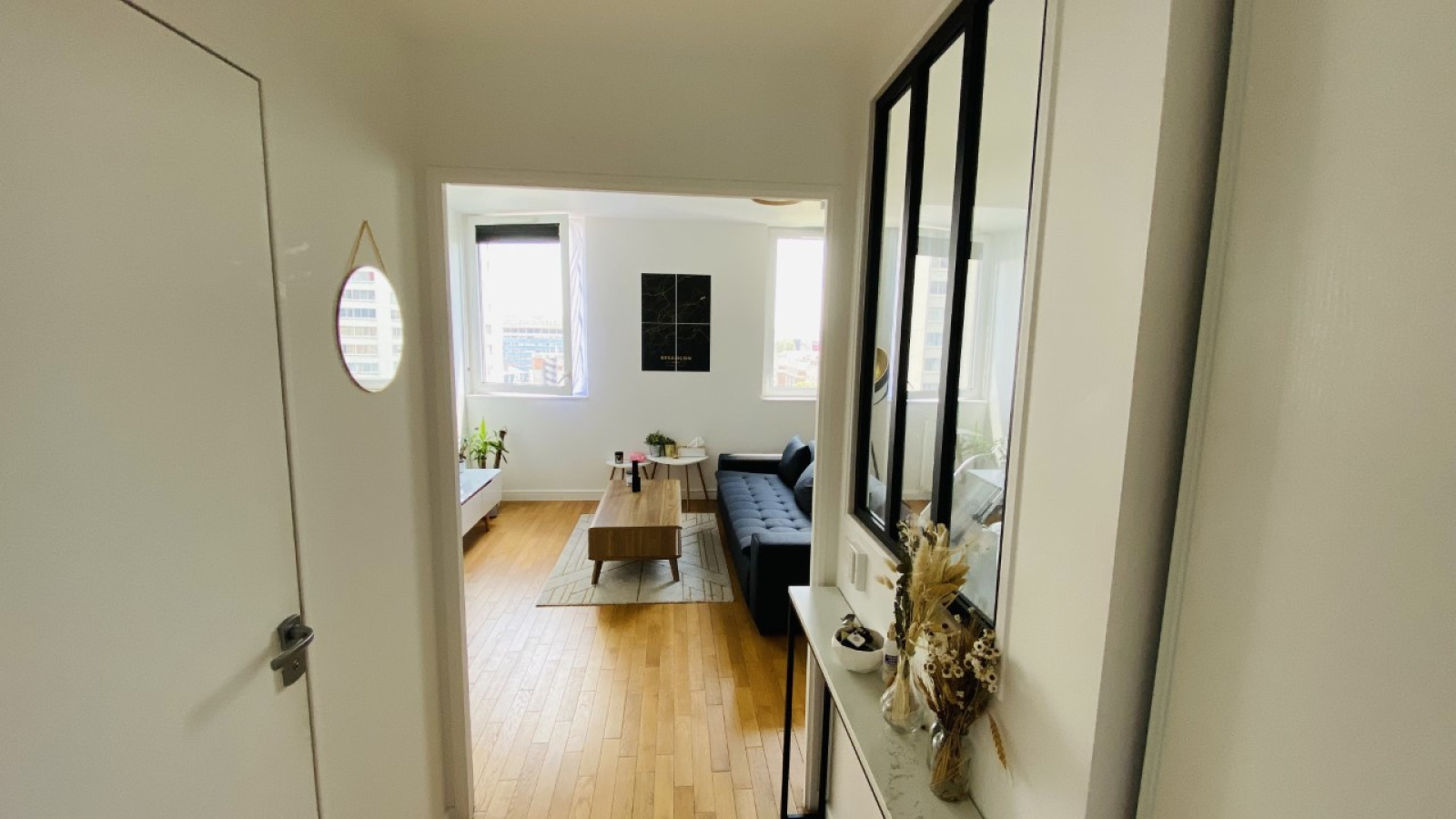 Appartement de 46.7m² situé à 15 min à pied de la Place d'Italie en étage élevé avec ascenseur dans une résidence de haut standing, sécurisée et surveillée, gardiens, vidéophone et caméras.L'appartement est composé d'une cuisine équipée en granite ouverte sur le séjour toute équipée avec du matériel haut de gamme (double four, lave vaisselle, frigo connecté, hotte escamotable, cave à vin encastrable, cafetière encastrable et micro-ondes), d'une chambre avec 1 lit double ainsi que plusieurs rangements, une salle d'eau et un wc séparé.L'appartement refait à neuf il y a moins de 1an, lumineux avec une vue dégagée et parquet en chêne massif. Idéal pour un couple. Nombreux commerces à proximité. Métro Porte de Choisy ligne 7 et tram 3a en bas de l'immeuble ou Maison Blanche ligne 7 à 5 minutes.