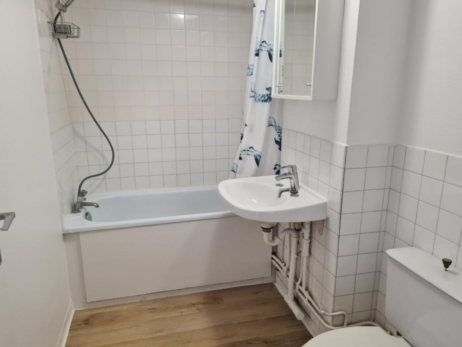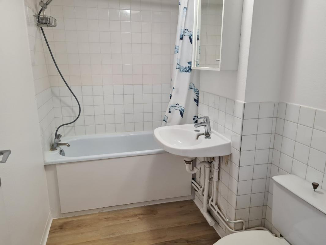 Lumineux, en très bon état, loué avec une kitchenette aménagée et équipée d'un réfrigérateur, d'un four et d'une machine à laver.