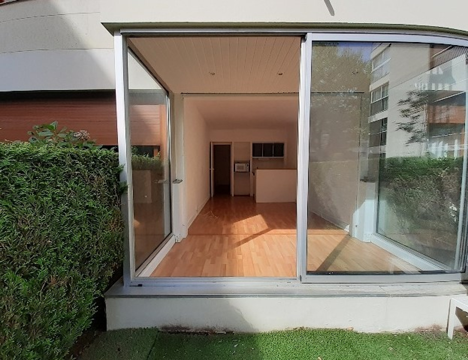 Studio avec jardin privatif, composé d'une entrée, une salle de bain, un séjour avec kitchenette, une loggia fermée