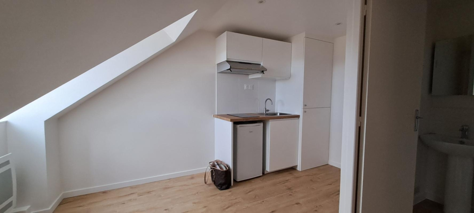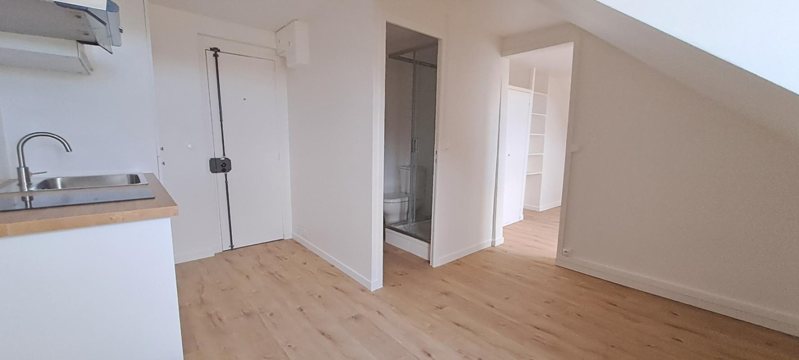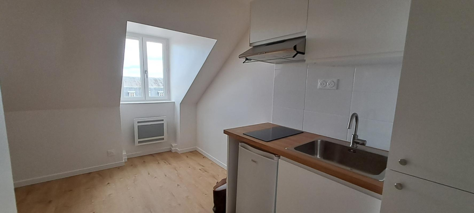 Très bel appartement mansardé au 4ème sans ascenseur, entièrement refait, comprenant une grande cuisine déjeunatoire, une chambre avec rangements, une salle de douche avec wc.