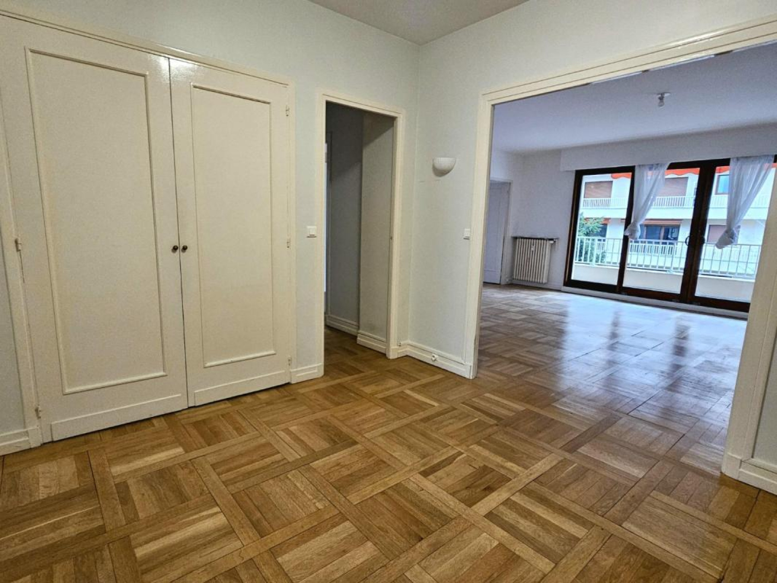 Entièrement traversant, l'appartement est composé d'un hall d'entrée qui dessert une cuisine fermée et aménagée, une première chambre, un couloir et le grand séjour de 37 m² s'ouvrant sur un balcon filant vers une autre chambre, qui dispose d'un placard intégré.