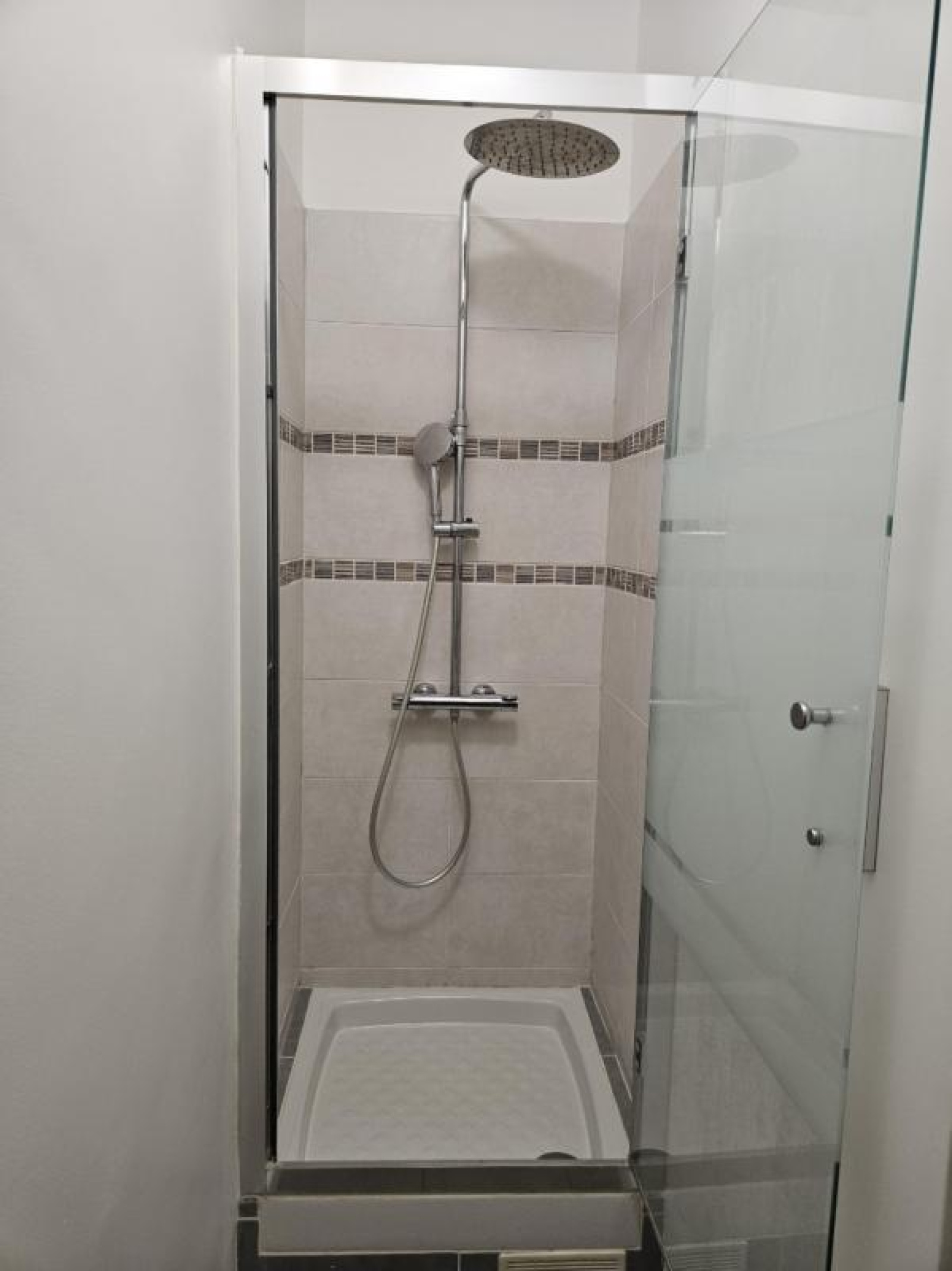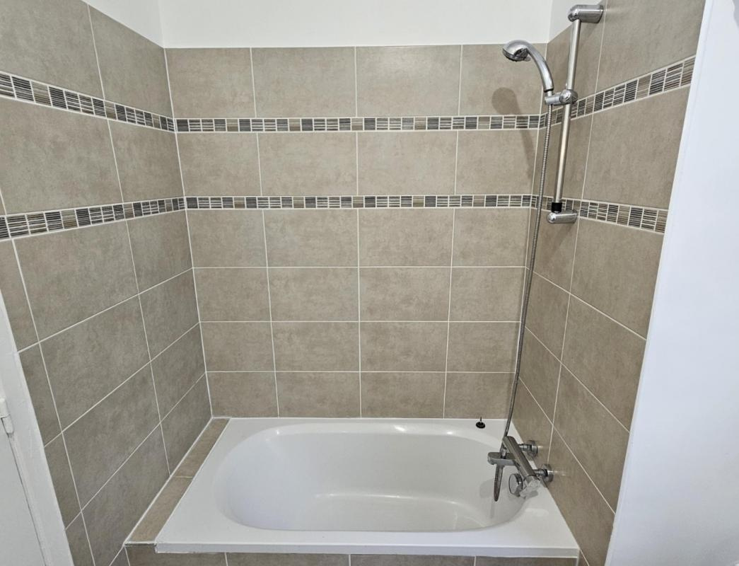Au centre de l'appartement : un dégagement avec une salle de douche, la troisième chambre, une salle de bains et un deuxième w-c avec lave-mains.