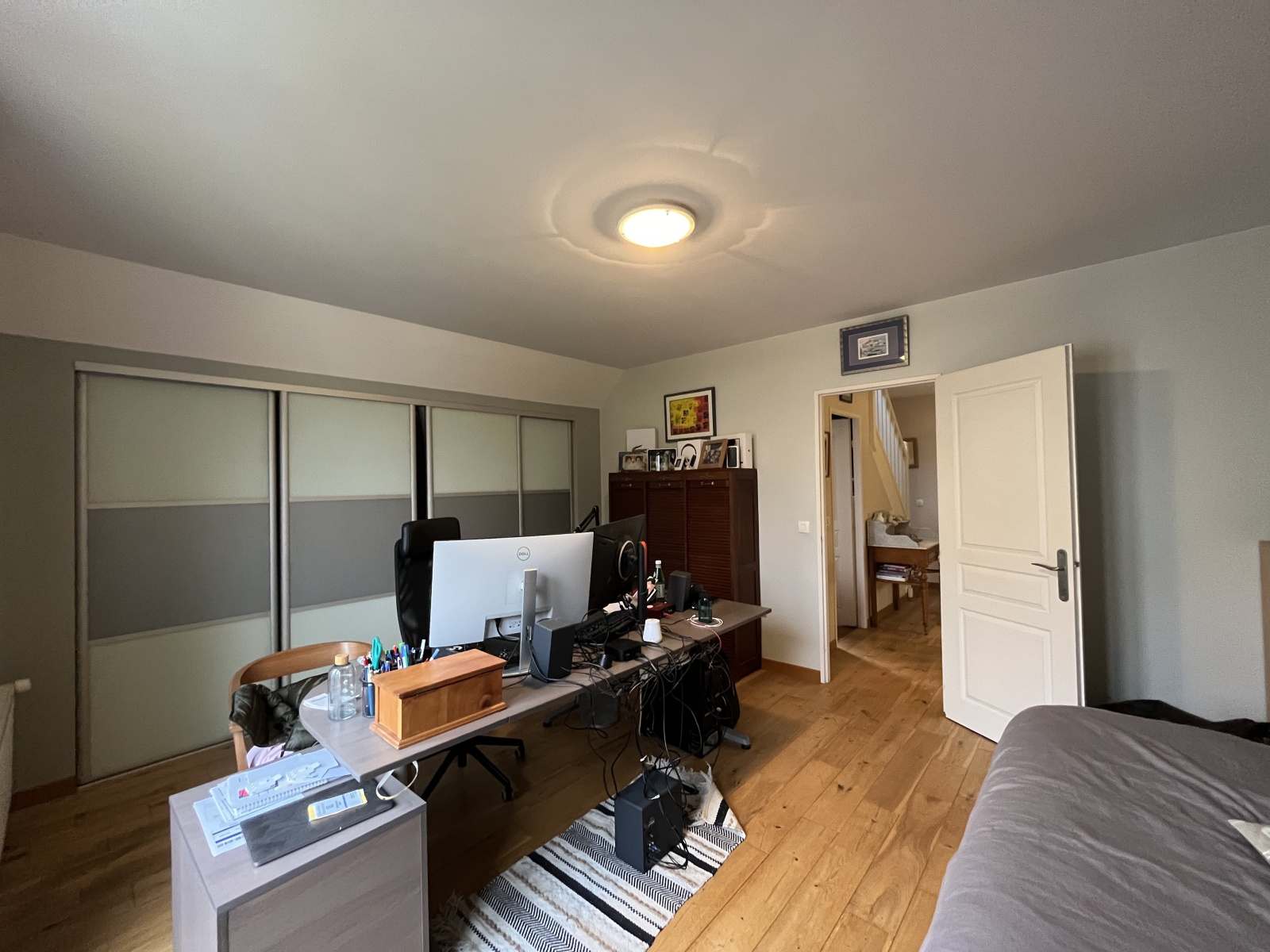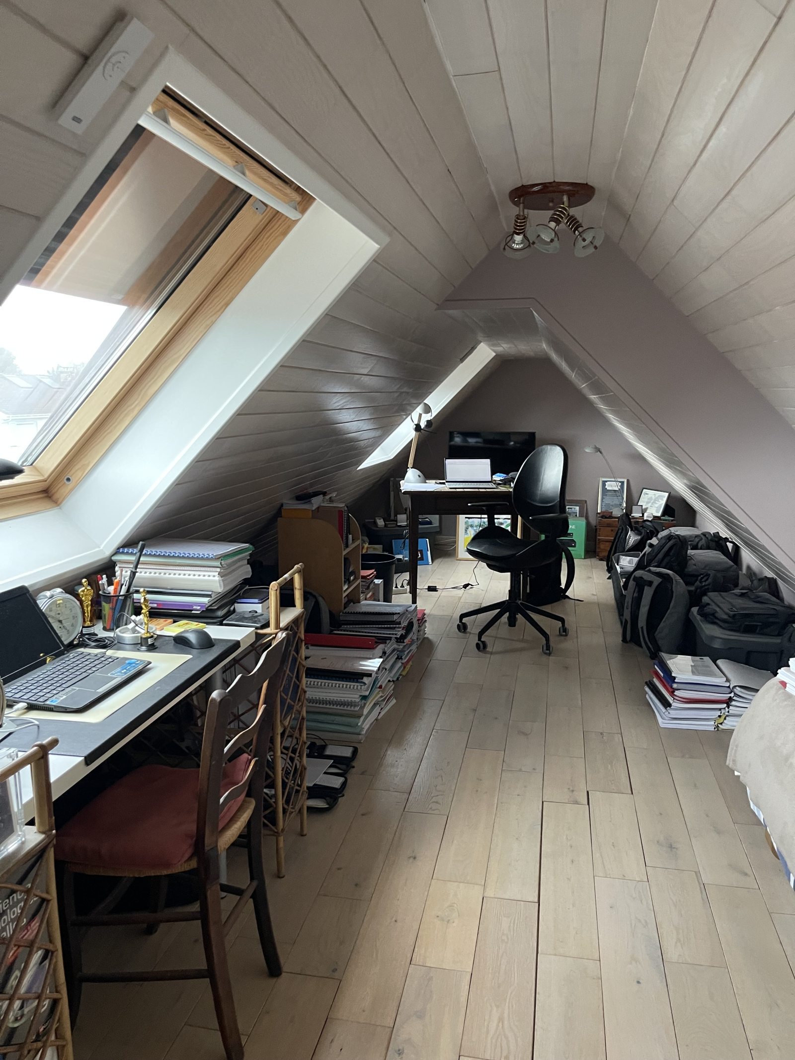 Combles entièrement aménagés, véritable pièce de vie supplémentaire ( chambre/ bureau/ salle de jeu) avec parquet en chêne blanchi dotée de 3 vélux avec volets roulants électriques (solaire) et en sus une pièce débarras fermée entièrement aménagée également.