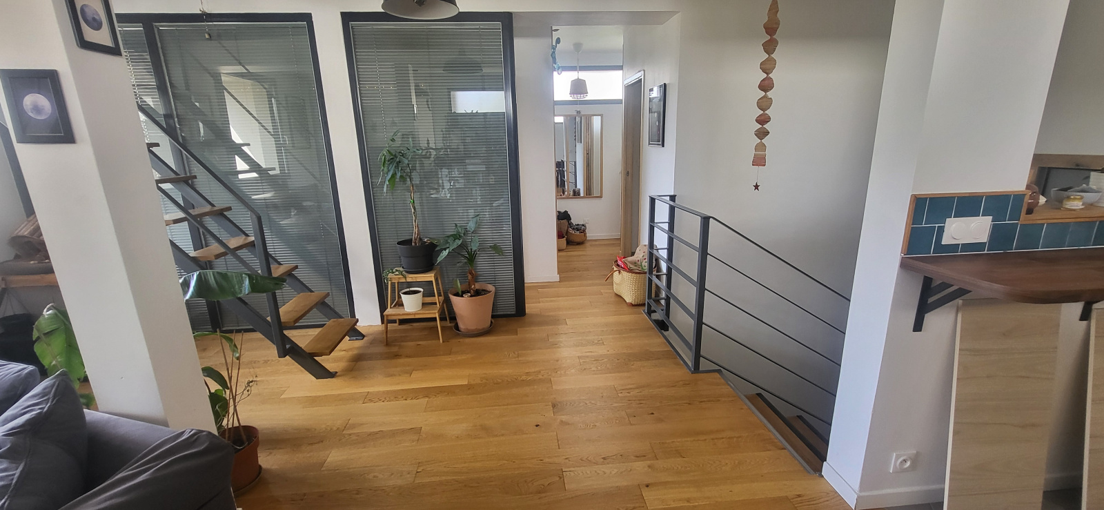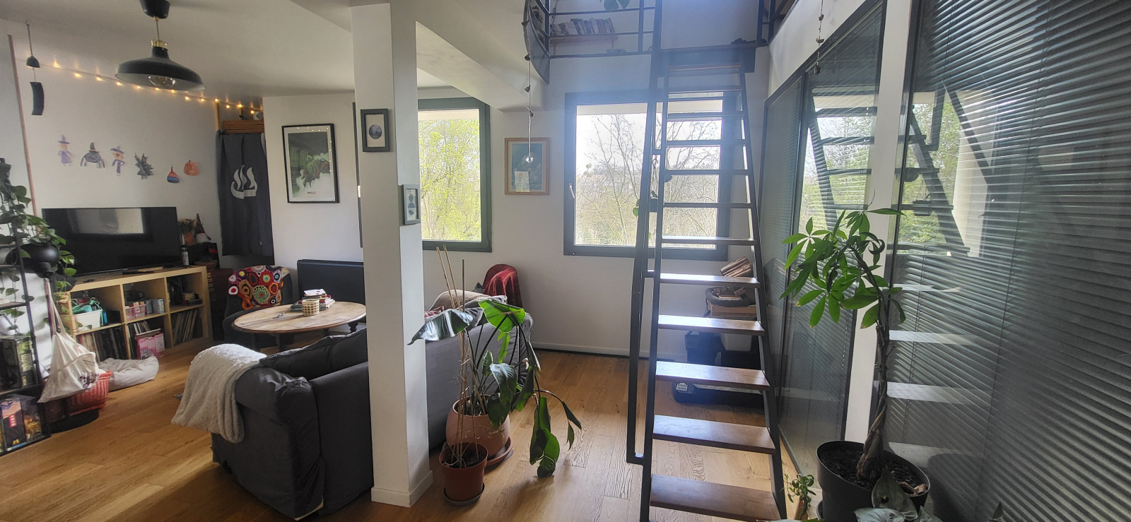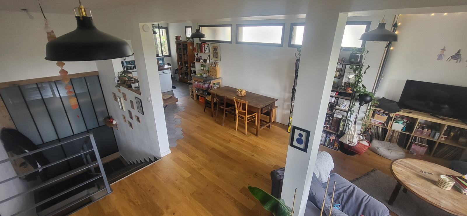 L'appartement très lumineux, propose une entrée desservant un grand séjour avec cuisine industrielle ouverte et équipée, deux chambres au rez-de-chaussée, et à l'étage un grand espace mezzanine bureau, et deux chambres mansardées.