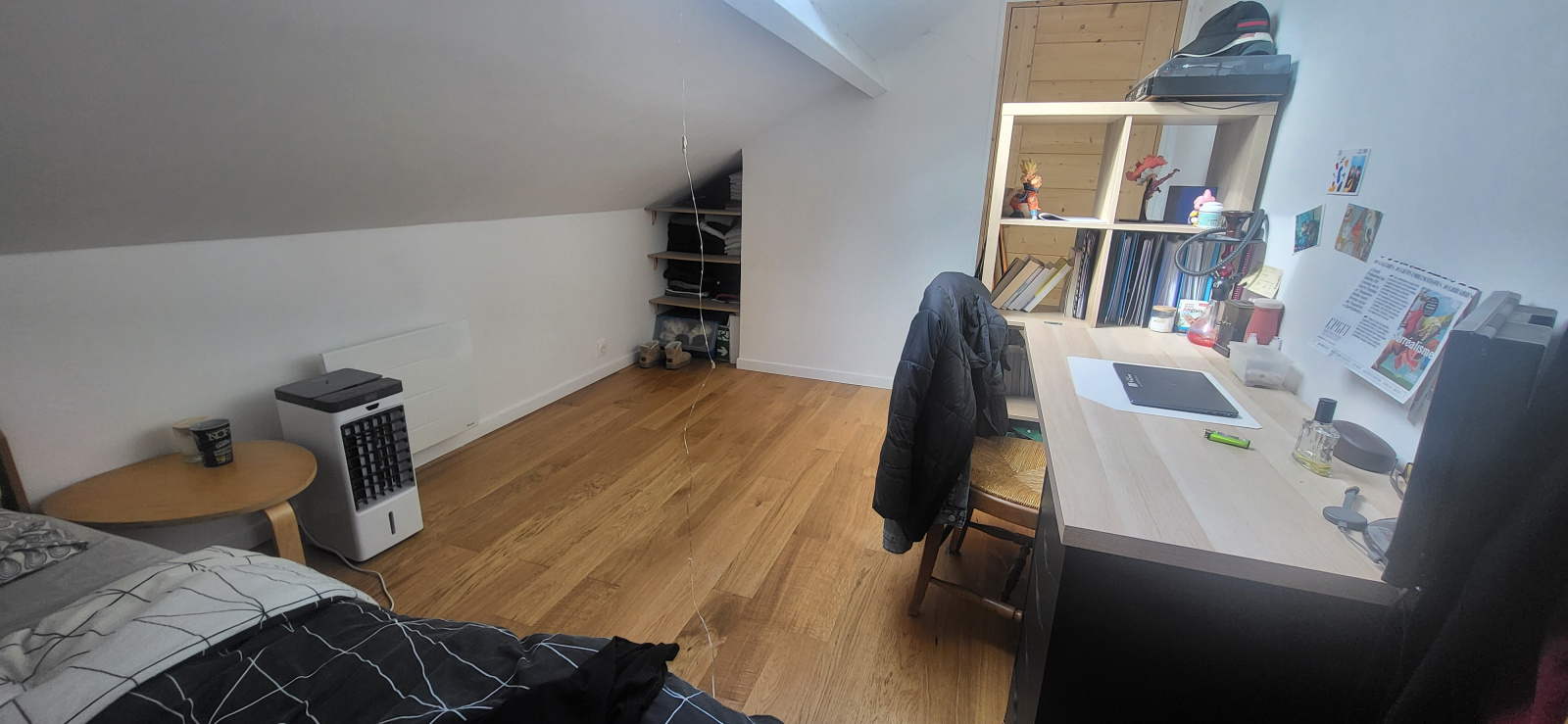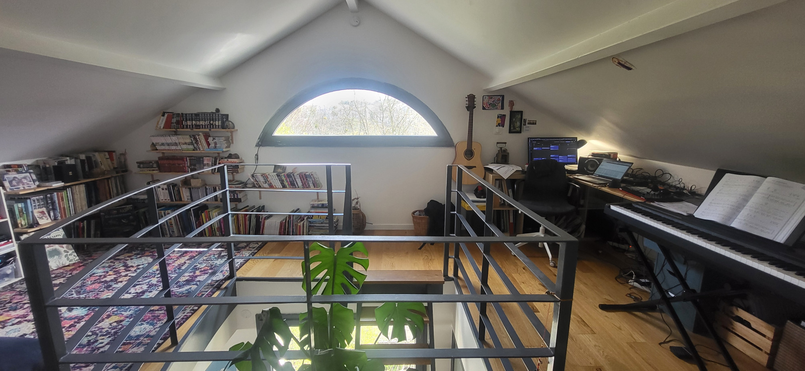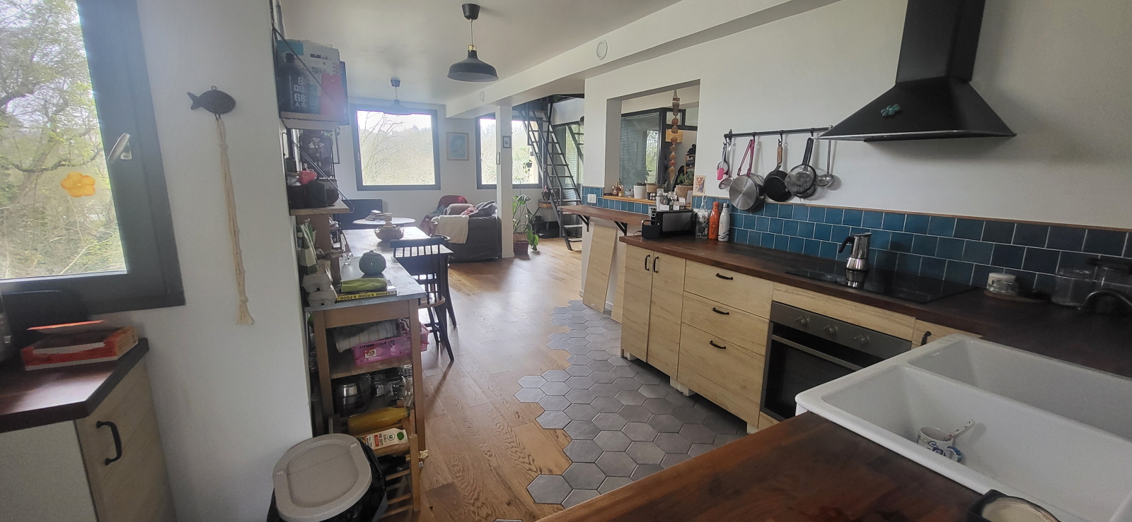 L'appartement très lumineux, propose une entrée desservant un grand séjour avec cuisine industrielle ouverte et équipée, deux chambres au rez-de-chaussée, et à l'étage un grand espace mezzanine bureau, et deux chambres mansardées.