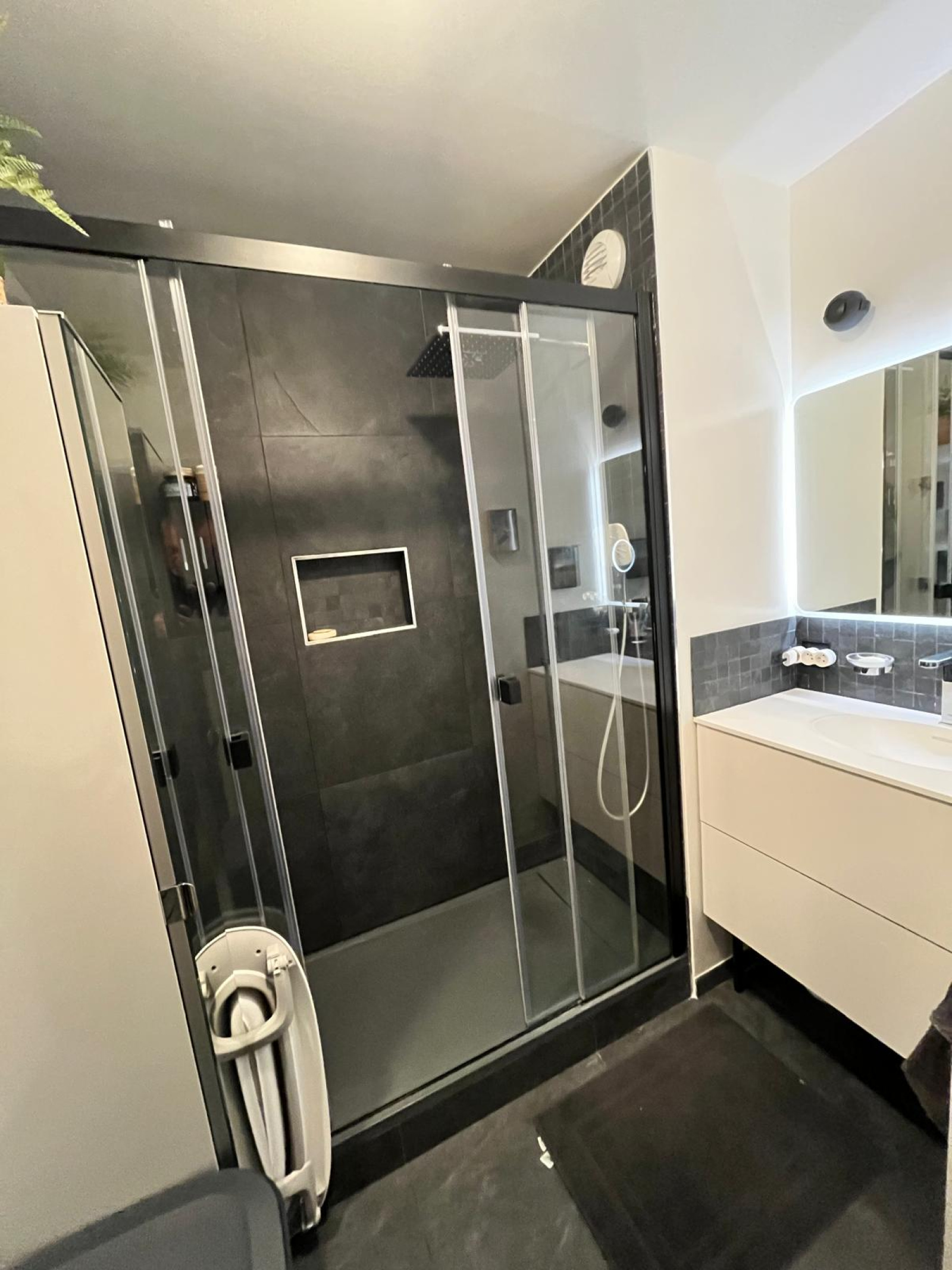 L'appartement se compose d'une entrée avec placard, de deux chambes avec chacune un placard, d'une pièce à vivre salon/salle à manger orienté Sud avec accès sur la terrasse de 50 m2, une douche à l'italienne, et des WC séparés.