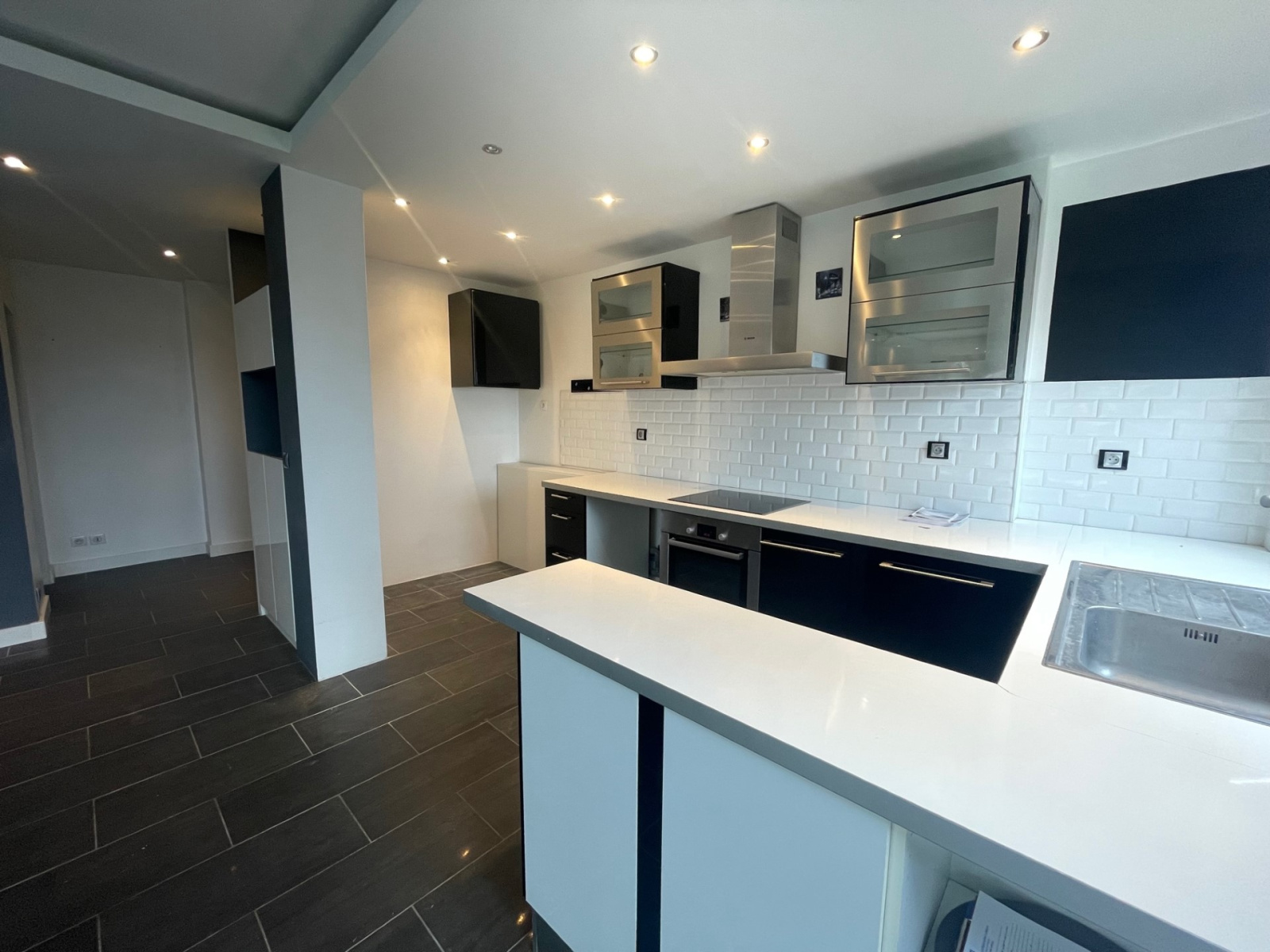 Une cuisine aménagée et semi équipée ouverte sur le séjour.