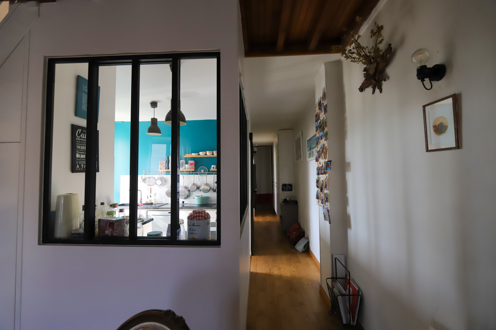Au rez-de-chaussée, vous trouverez une grande pièce de vie très luminiseuse avec des poutres apparentes, une verrières qui séparent la cuisine du séjour. Il y au une chambre et une salle de bains.