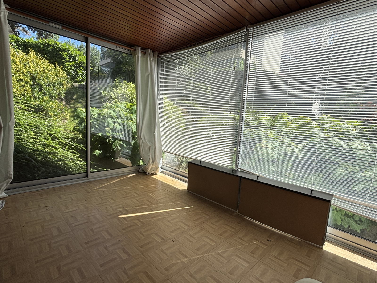Grand studio composé d'une entrée desservant une vaste pièce principale prolongée par une loggia vitrée avec double vitrage exposée plein ouest donnant sur la verdure, une cuisine équipée, une salle de bain avec wc et grands rangements.