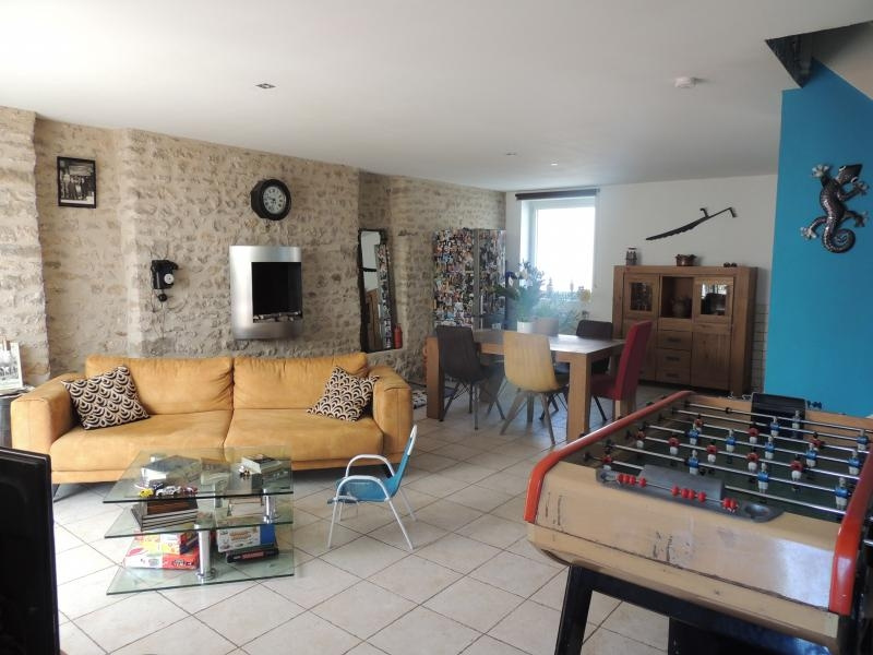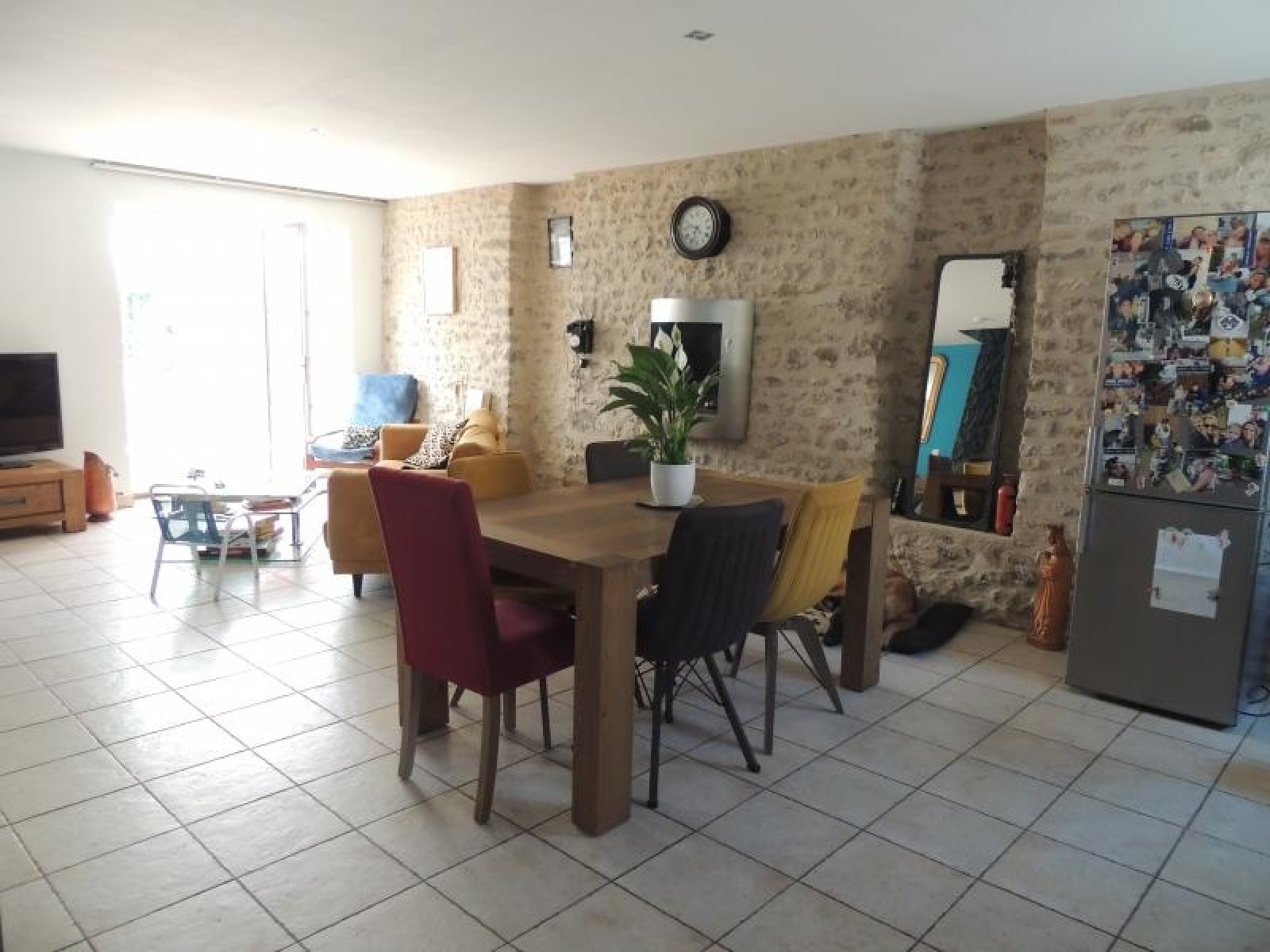 Au rez de chaussée : Entrée sur une grande pièce à vivre de 45m2 et pierres apparentes cuisine ouverte équipée et aménagée. Cellier et WC.