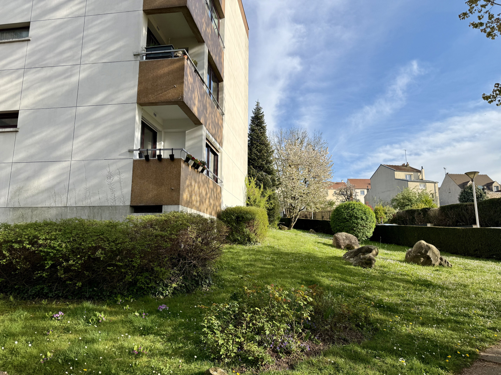 Rez-de-jardin exposé SUD OUEST offrant : entréespacieuse avec rangements, séjour avec accès sur la terrasse et son jardin d'environ 40 m², cuisine neuve équipée et fermée avec un accès balcon, deux spacieuses chambres (13 et 14 m²) dont une donnant sur le jardin, salle de bains et WC.