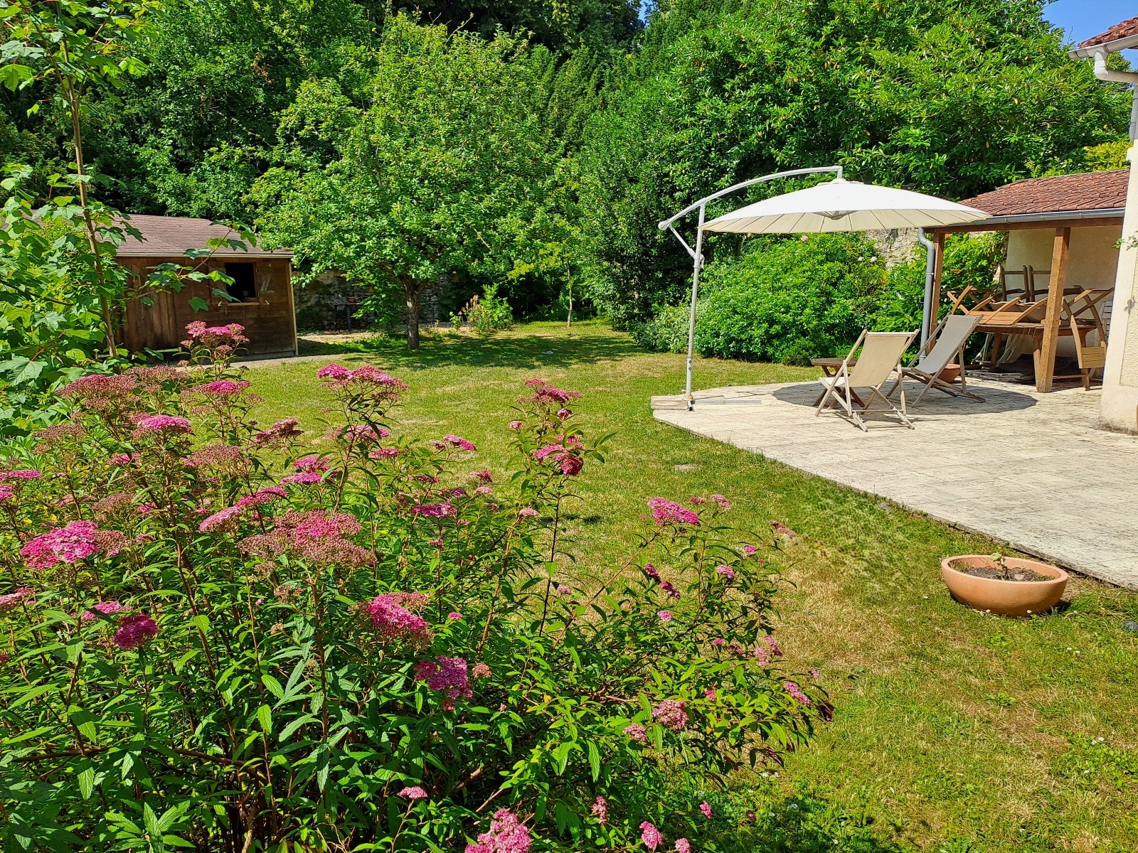 Le jardin clos et arboré est agrémenté d'une terrasse en partie couverte.