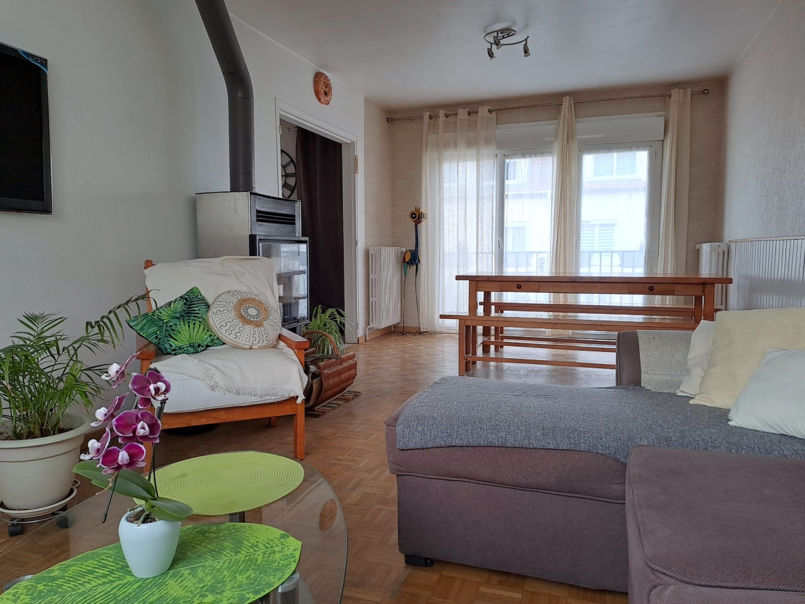- au rez-de chaussée élevé, d'un séjour d'environ 24m² avec poêle à bois et balcon, d'une cuisine équipée ouverte, d'un wc indépendant, d'une salle de bains, d'une chambre avec placard et d'un bureau,
