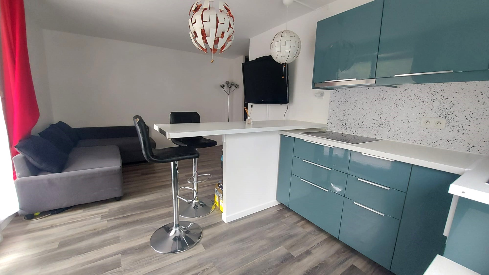 Appartement comprenant une entrée, 2 chambres, une salle de bain, une cuisine américaine aménagée et équipée donnant sur un salon.