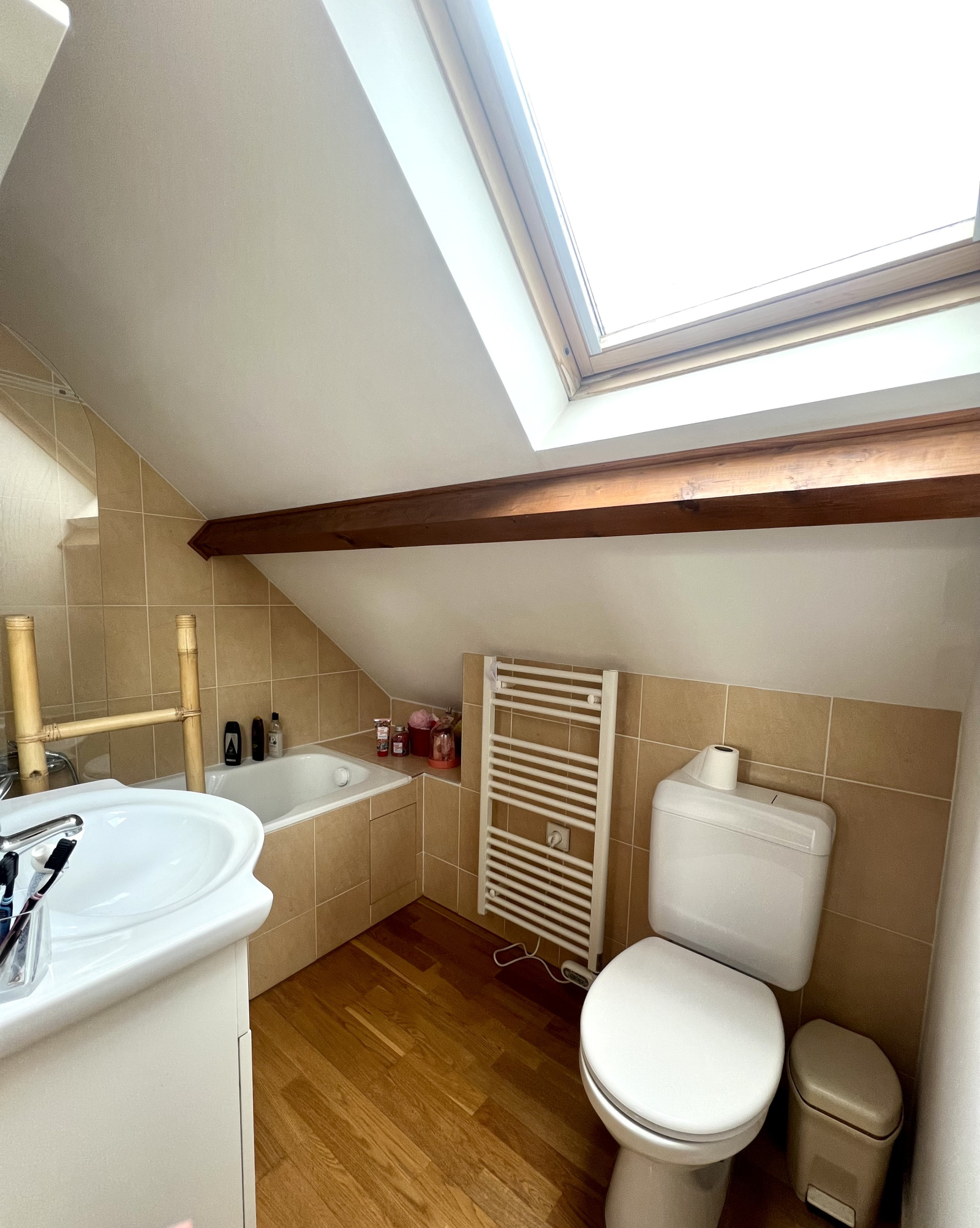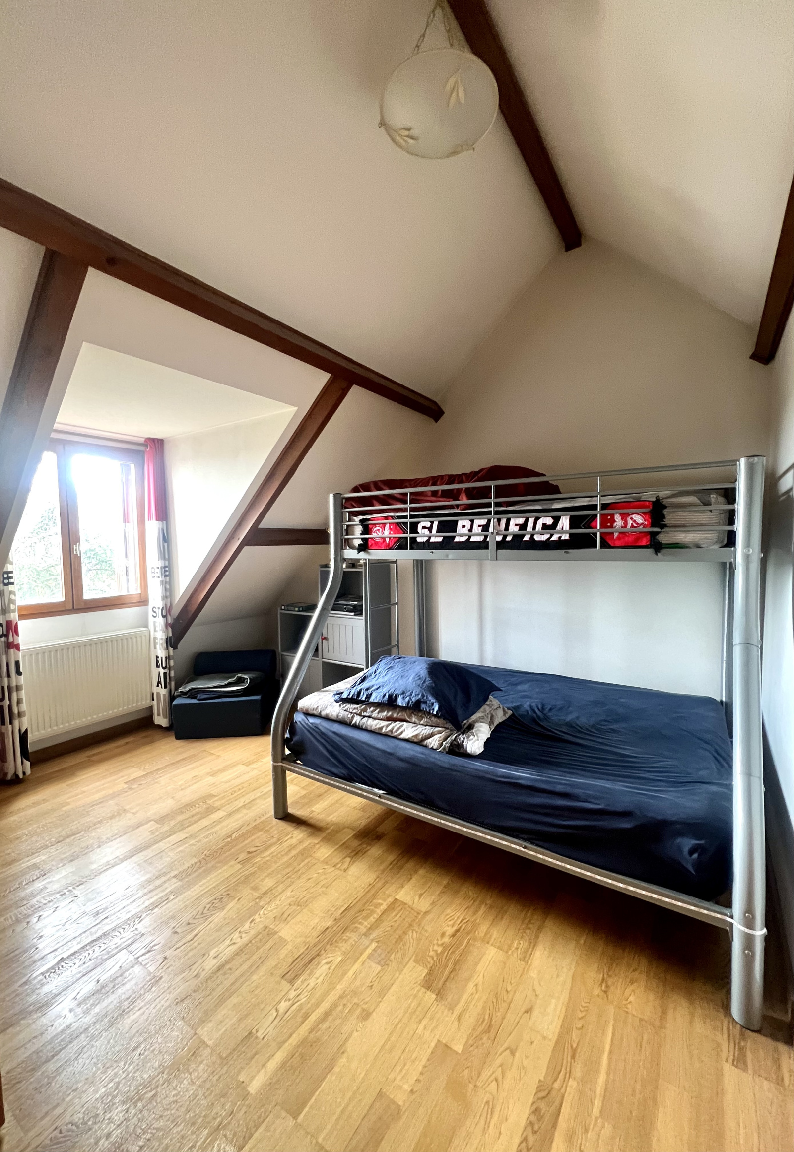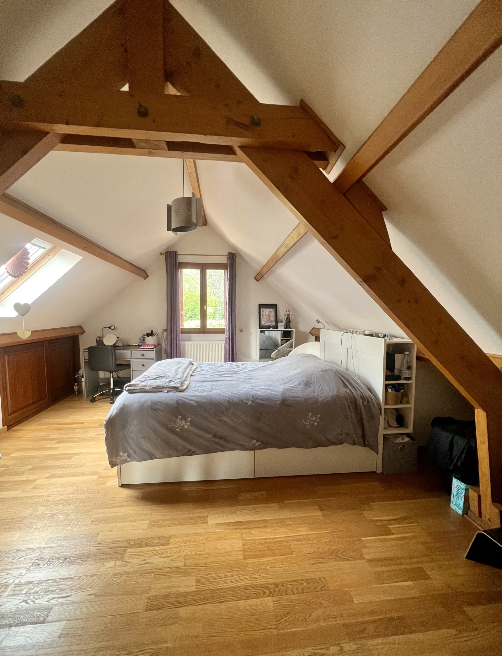 A l'étage se trouvent 2 grandes chambres dont une avec salle de bains et un espace mezzanine avec des rangements et un bureau.