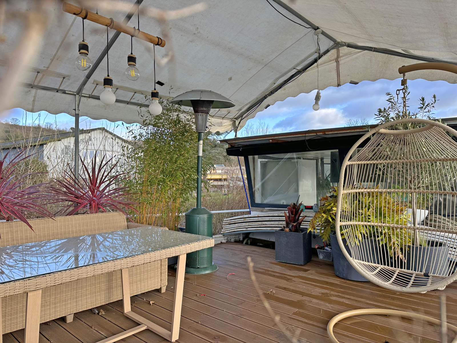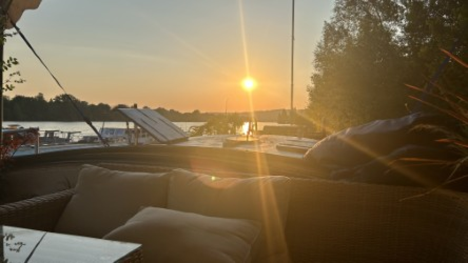 Une grande veranda pour profiter de la nature et une terrasse couverte de 24m2 à l'avant du bateau pour profiter des belles soirées au couché du soleil.