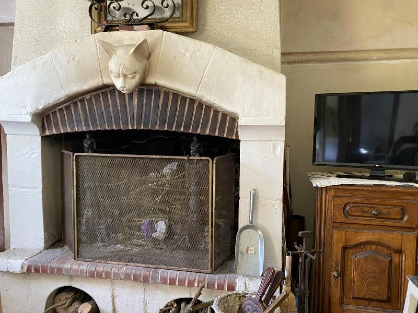 Un séjour avec cheminée, une cuisine aménagée et équipée, une chambre et une salle de bain.