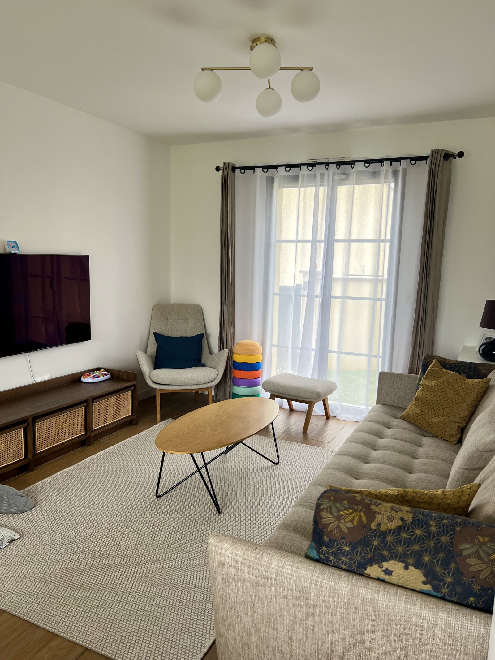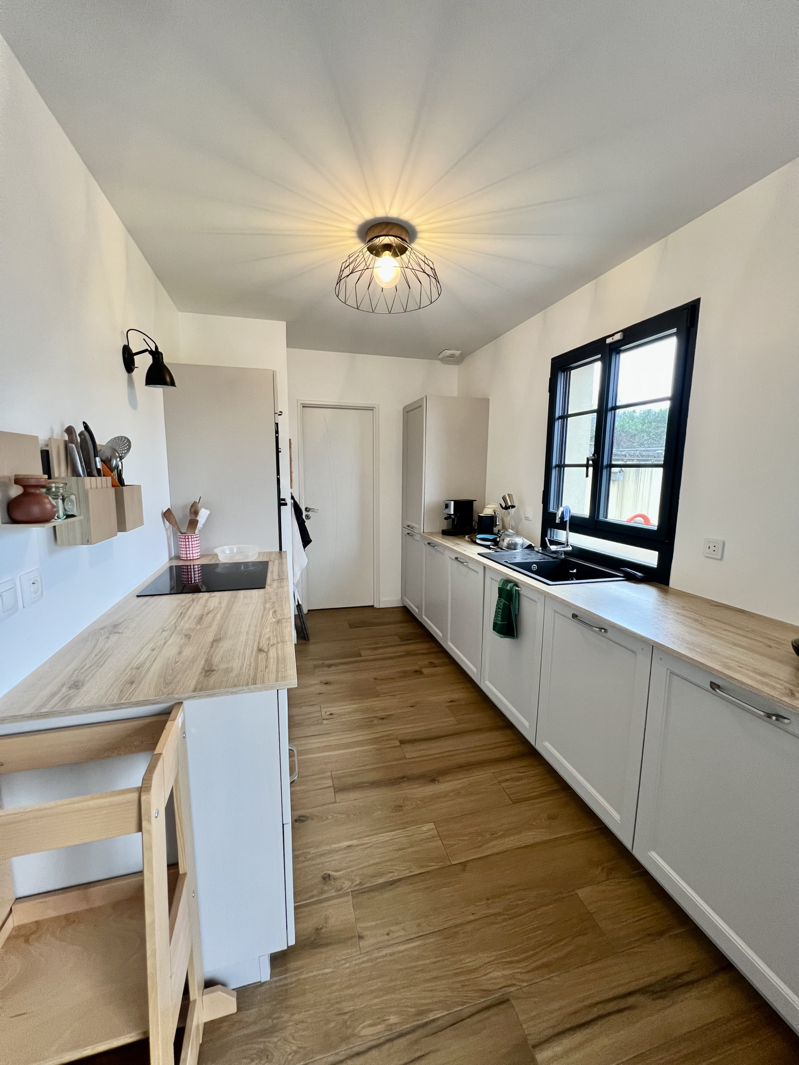 Au rez-de-chaussée, un espace de vie de 45m2 lumineux , traversant, s'ouvre sur une terrasse bois de 27m², parfaite pour profiter des beaux jours. La cuisine équipée Schmidt, le bureau (convertible en chambre : 11m2), le cellier/buanderie, le WC invités et les nombreux rangements optimisent l'espace.